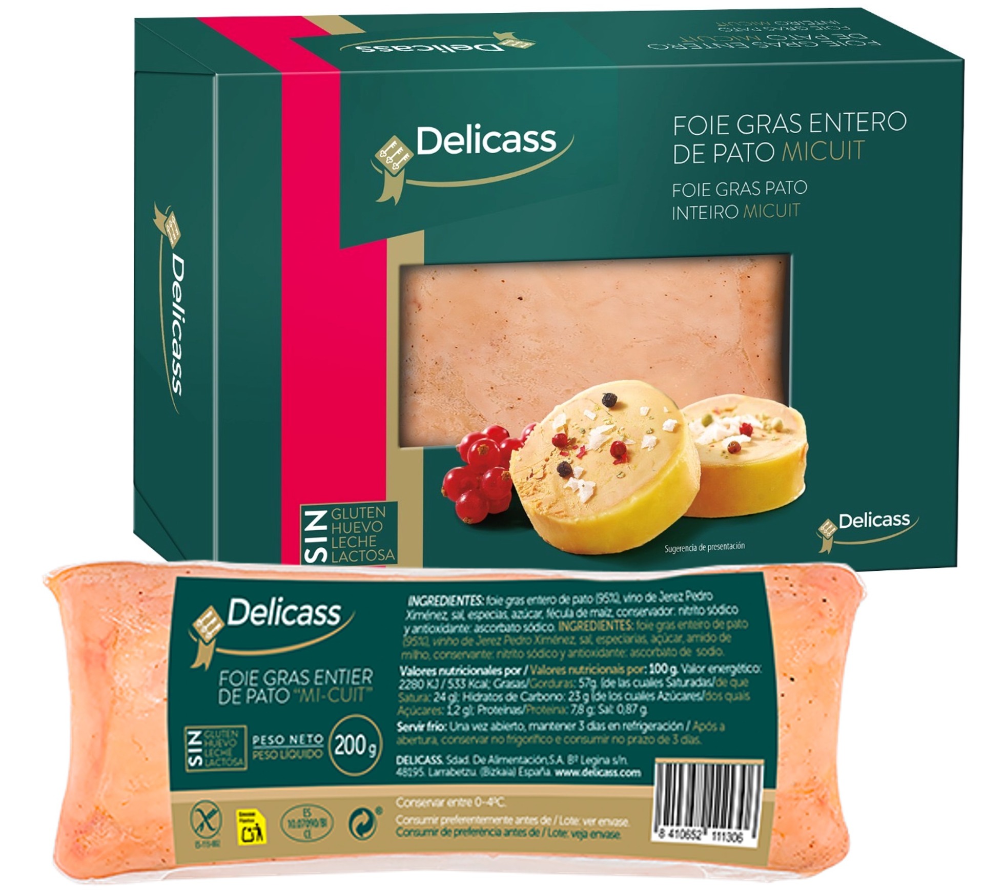 Descripción del producto La selección de los mejores lóbulos de hígado de pato crean nuestro foie gras entero de pato mi cuit, condimentado con sal, pimienta negra molida y cocido a baja temperatura para mantener la sutileza del corazón del Norte. Su exquisito sabor nos transporta a la tradición: textura fundente en boca, permanencia en el paladar y gusto delicado. En resultado, un foie gras de pato sabroso e inigualable. El aliado perfecto para compartir y disfrutar en compañía. Ingredientes Foie gras de pato, sal, azúcar, pimienta y licor. Conservador: Nitrito sódico. Antioxidante: Ascorbato sódico. dirección Sacar el Foie Gras del frigorífico y mantenerlo a temperatura ambiente entre 5 y 20 minutos antes de degustarlo para poder apreciar todas sus cualidades. Una vez abierto, cortar en lonchas finas. Para ello utilizar un cuchillo bien afilado, previamente pasado por agua caliente, y efectuar los cortes sobre el foie gras frío. También se puede utilizar una lira de cortar queso o mantequilla.